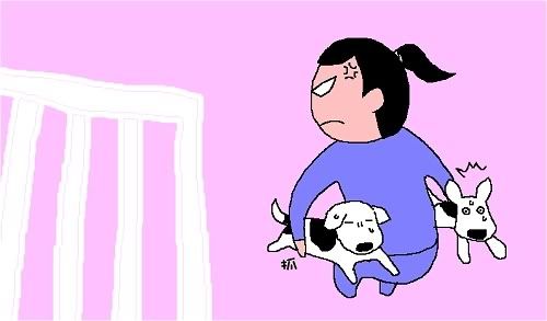 馬上蹲下,左手夾MooMoo,右手夾妹妹